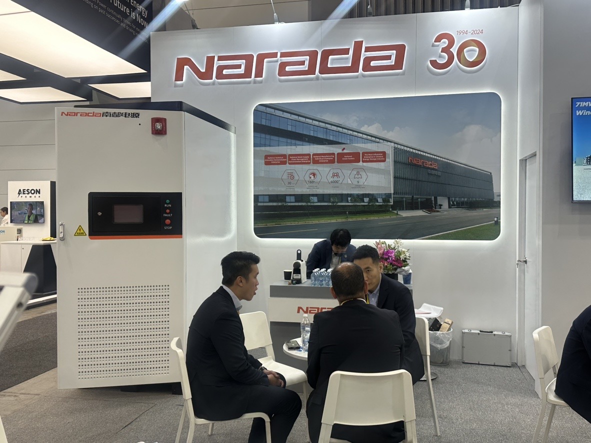 Narada Power showcased several energy storage products and solutions, including the Center L Plus 6MWh+ Liquid Cooling Energy Storage System, 80Ah-690Ah energy storage battery, and the Edge233L Liquid Cooling All-in-one Cabinet, highlighting the company’s innovative achievements.